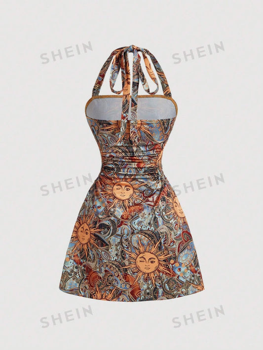 SHEIN MOD 1 pieza Vestido mini de punto con estampado bohemio vintage, con lazo de atar al cuello para mujer