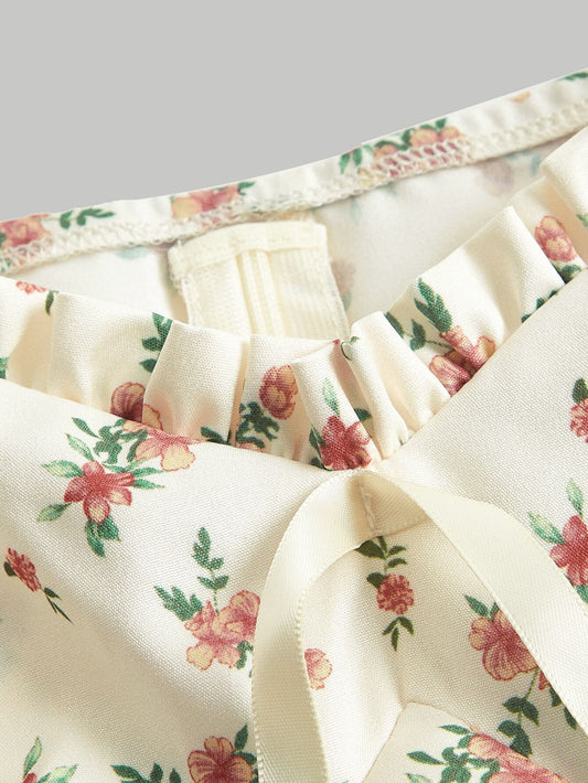 SHEIN MOD Camiseta con patrón floral ribete en forma de lechuga con lazo delantero