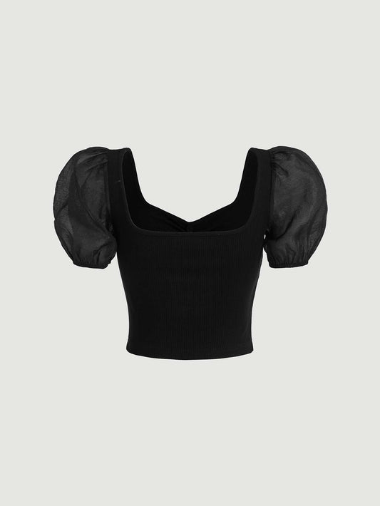 SHEIN MOD Camiseta de malla en contraste de manga farol pecho con fruncido