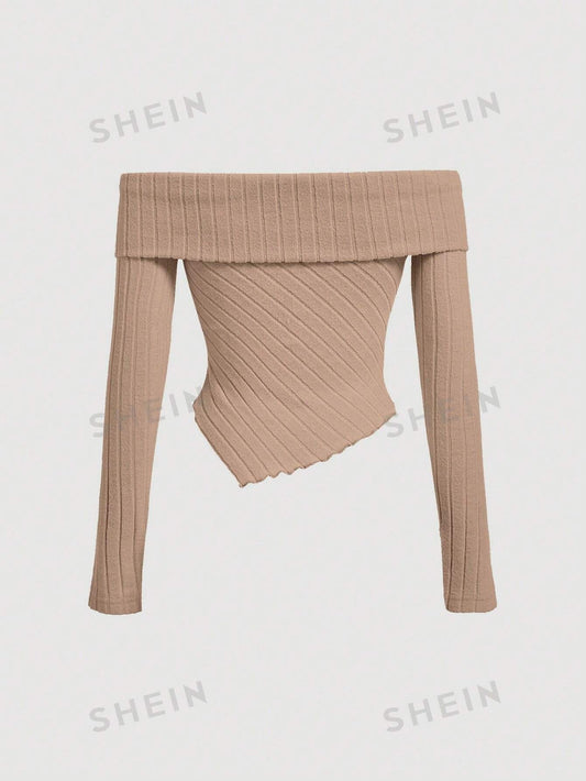 SHEIN MOD Camiseta De Manga Larga Con Hombros Descubiertos Y Lazo Decorado Para Mujer