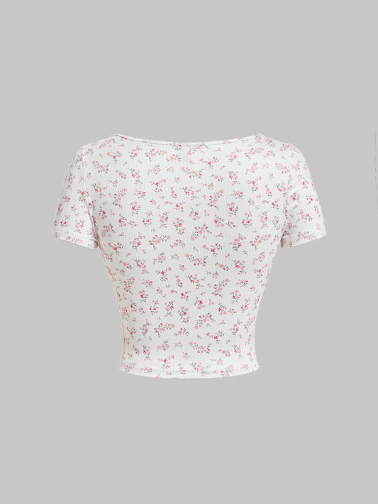 SHEIN MOD Camiseta De Manga Corta Para Mujer Con Nudo Frontal Y Cuello Redondo Con Estampado Floral Para El Verano