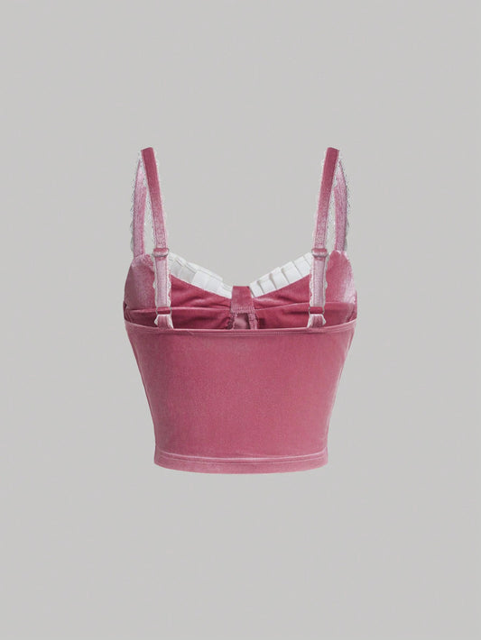 SHEIN MOD Camiseta sin mangas linda con aplicación de encaje, parche y moño, atuendo para despedida de soltera, camiseta rosa, atuendo de otoño