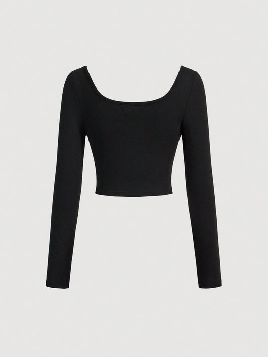 SHEIN MOD Camiseta de manga larga con cuello cuadrado de terciopelo negro para mujer, camiseta de invierno, camiseta "Old Money", estilo "Old Money" para mujer, atuendos de rave de festival, top de cuello cuadrado
