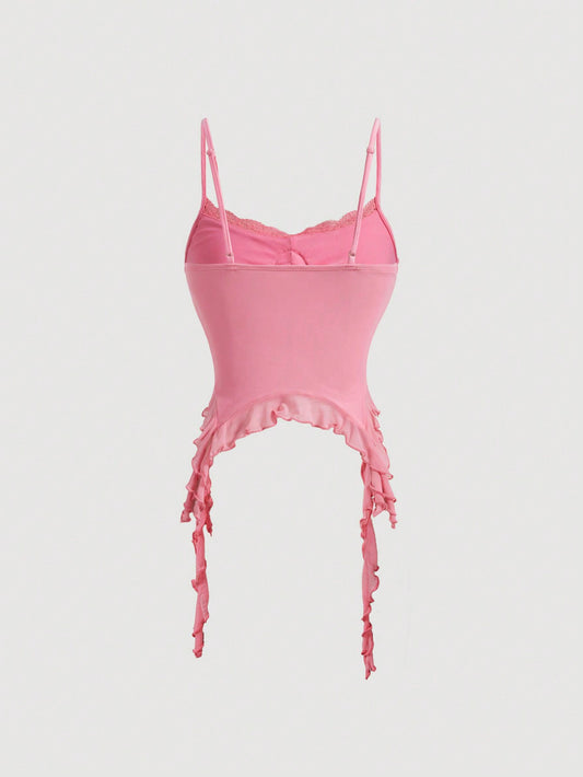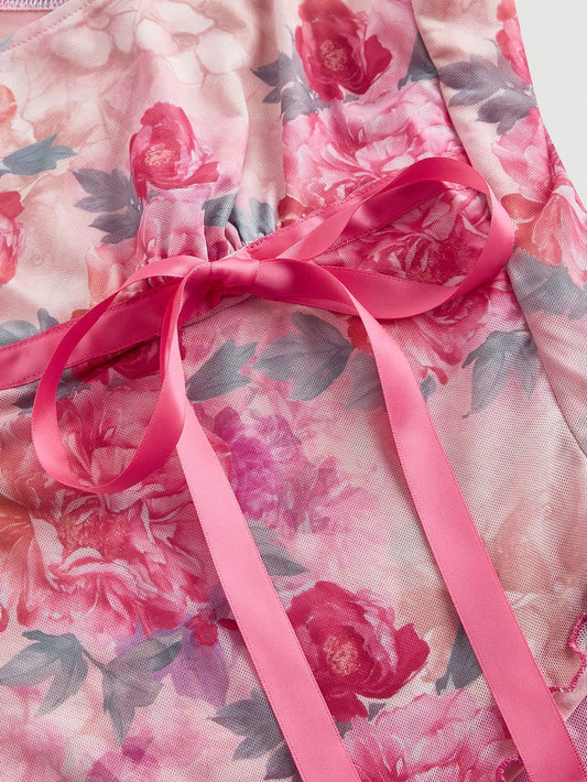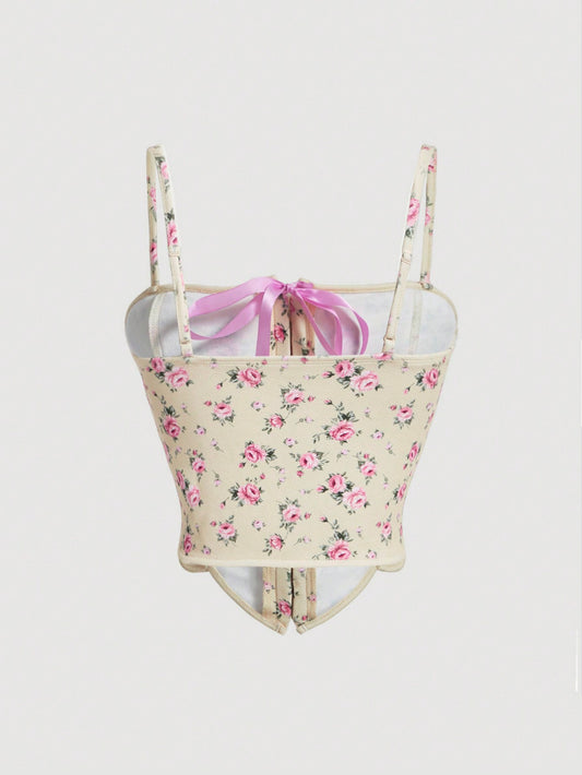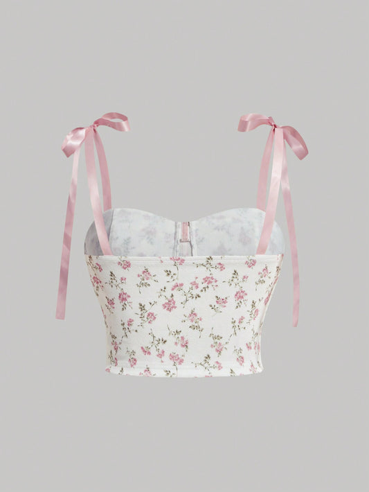 SHEIN MOD Parte superior de tirantes elegante de color rosa con decoración de cinta, dobladillo asimétrico y estampado de flores, para otoño, moda de los 90, franceses