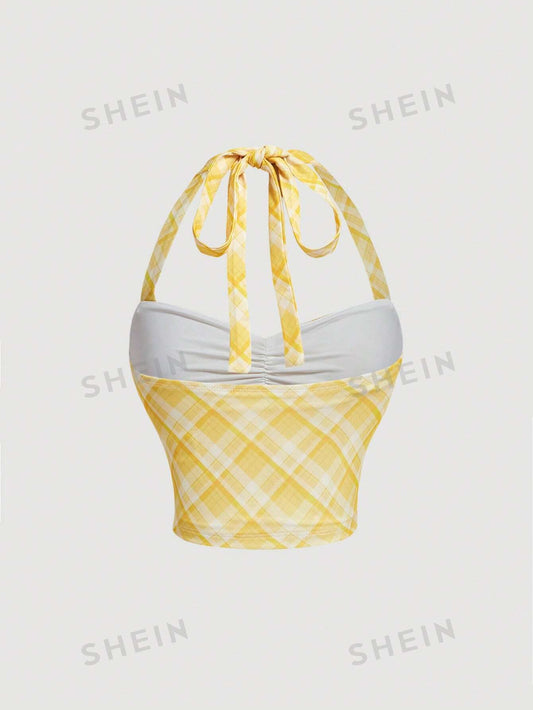 SHEIN MOD Top amarillo de cuadros con correa de cuello, top retro, top lindo de verano