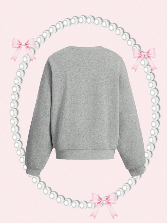 SHEIN MOD Sudadera holgada con cuello redondo gris, bordada adorablemente, ropa de regreso a la escuela, sudadera gris, sudadera con cuello redondo, atuendos de otoño para mujer