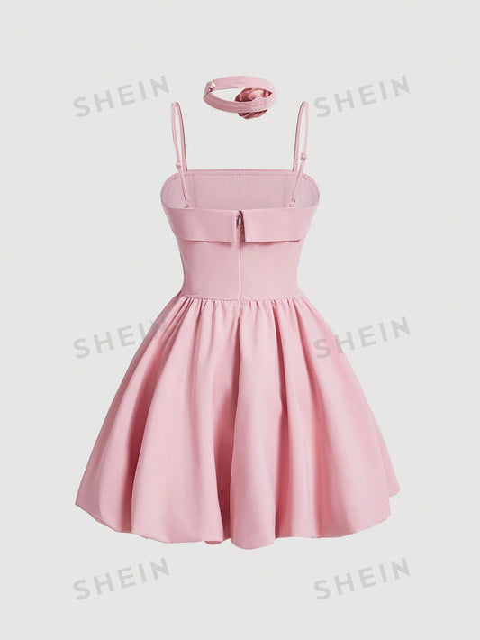 SHEIN MOD Top rosa romántico decorado con flor tridimensional y cinta, apto para fiesta, té, eventos formales, graduación, vacaciones, uso campestre y playero