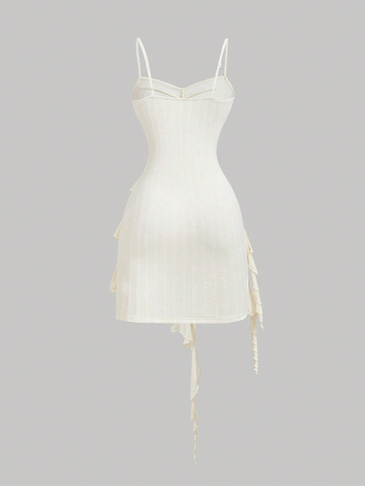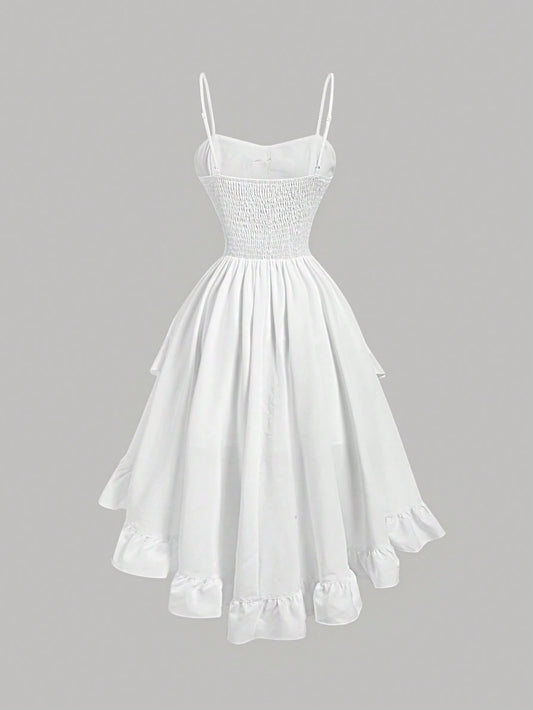 SHEIN MOD Vestido cami asimétrico vintage blanco con escote en forma de corazón, tirantes cruzados, ribete de volantes, adorno de moño rosa para mujer