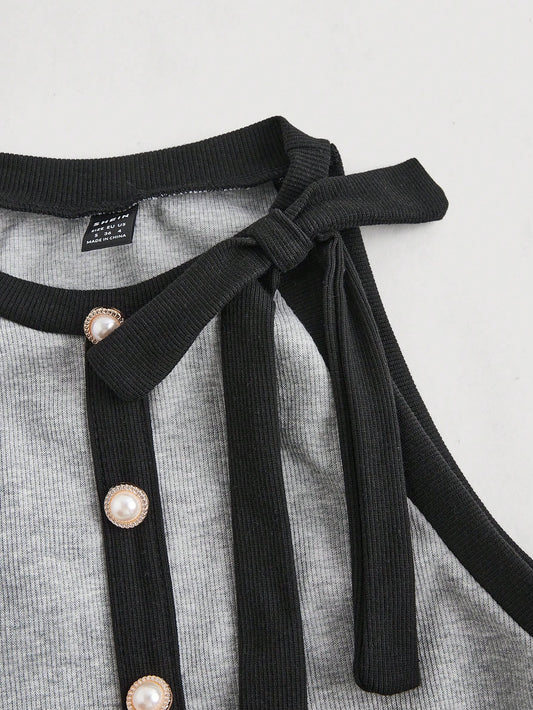 SHEIN MOD Top sin mangas de cuello redondo para mujer con decoración de botones y lazo en blanco y negro, estilo patchwork, perfecto para una cita nocturna