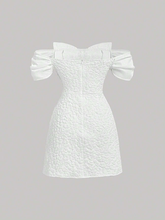 SHEIN MOD Vestido Blanco ajustado De Hombros Descubiertos Con Textura Y Detalle De Lazo Para Mujeres