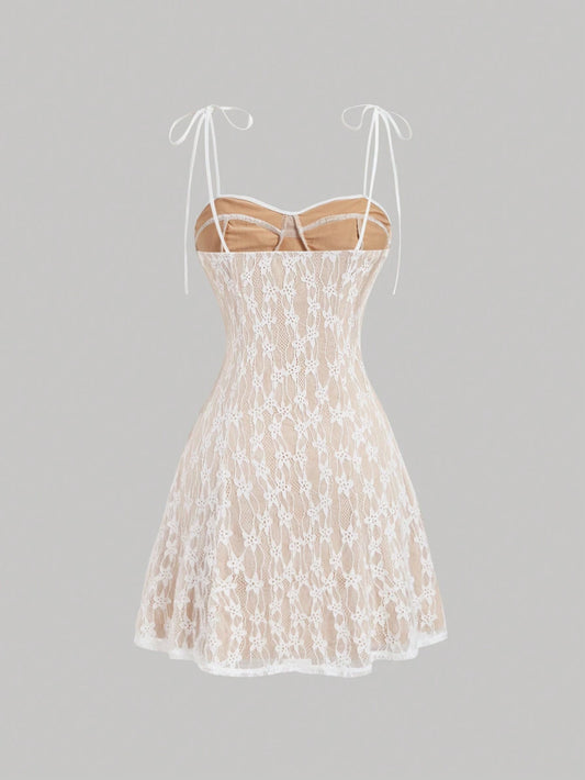 SHEIN MOD Vestido camisero romántico con tirantes de lazo, volantes de encaje y borde plisado, conjunto para festival, vestido de mujer, vestido mini, vestido fluido, vestidos de otoño, conjunto para concierto