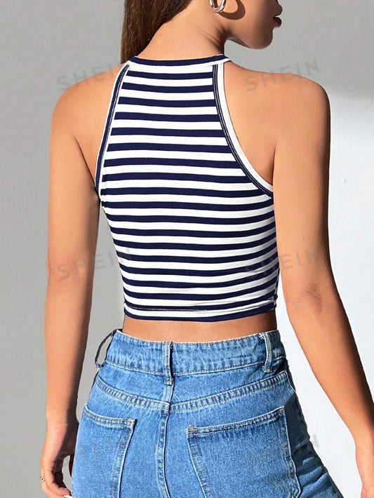 SHEIN PETITE Camiseta sin mangas con cuello halter estampado de rayas y diseño ajustado para mujer, ideal para verano