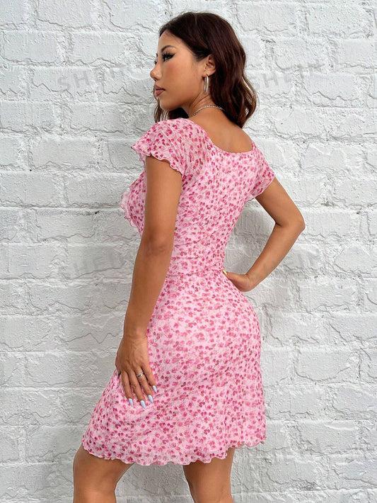 SHEIN PETITE Vestido corto de punto con cuello cuadrado rosa con estampado floral pequeño, adecuado para vacaciones.