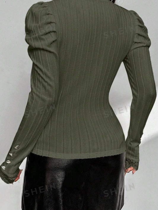 SHEIN Privé Camiseta De Manga Larga Entallada Con Detalle De Encaje Y Botones, Modelo Casual De Verano mujer