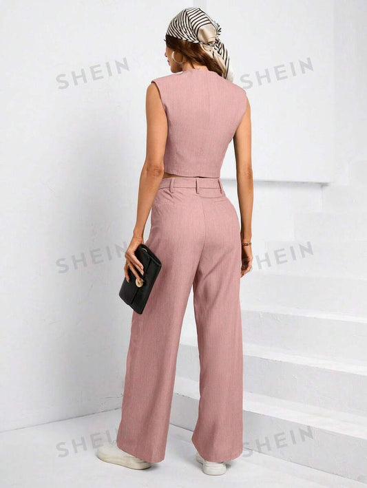 SHEIN Privé Conjunto de chaleco sin mangas y pantalones largos de botones lisos y de moda para mujer en verano