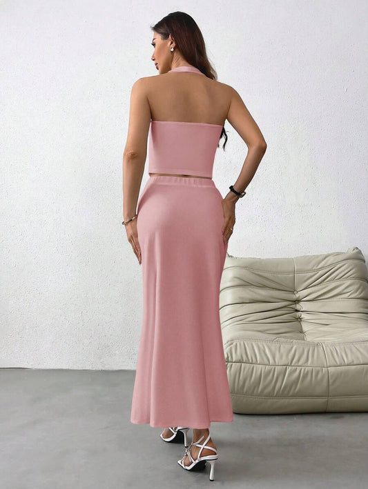SHEIN Privé de espalda abierta con cordón Top halter crop & Falda ajustada - Conjunto