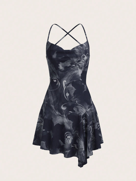SHEIN Privé Vestido corto con tirantes de espagueti, volantes, dobladillo asimétrico con color y espalda descubierta para mujeres. Vestido corto con tirantes cruzados en la espalda y espalda descubierta. Vestidos sexy. Vestido asimétrico. Vestido de veran