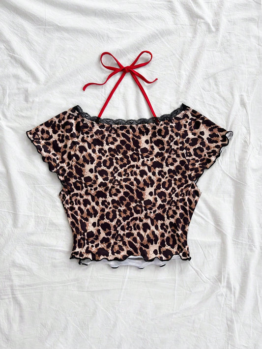 Soleia Camiseta ajustada de manga corta con cuello en V con volantes, lazo en el cuello y bloqueo de color con estampado de leopardo retro para mujer, ropa de mujer para Navidad