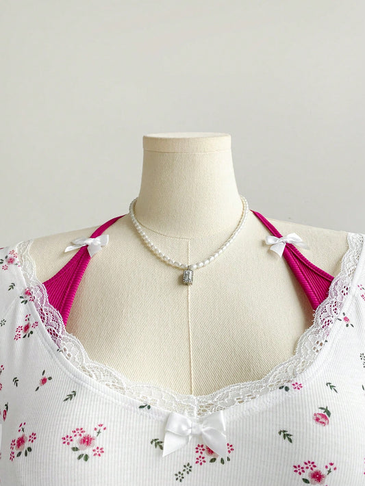 Soleia Camiseta de verano casual estilo ballerina para mujer talla grande, con cuello de encaje y splice de color contrastante, sin mangas, decorada con moño, en estampado floral vintage rojo y blanco