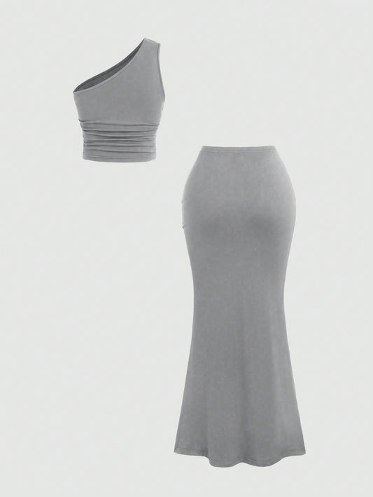 Sweetra Set de 2 piezas con top sin mangas de cuello asimétrico en unicolor y falda plisada con cordón, conjunto de estilo Y2K