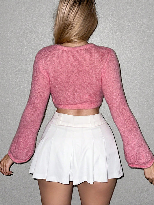 Sweetina Camiseta sexy de manga larga con dobladillo con abertura y nudo en la parte delantera con textura para mujer
