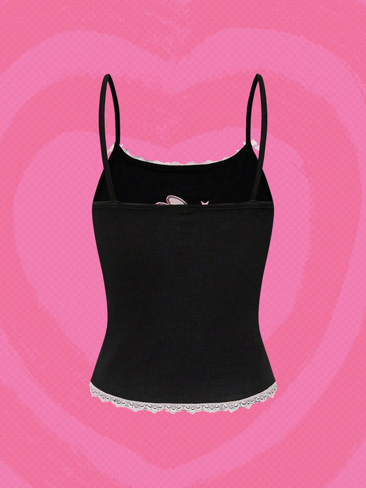The Powerpuff Girls | ROMWE Camiseta de tirantes con bordado de dibujos animados y detalle de lazo de encaje, verano