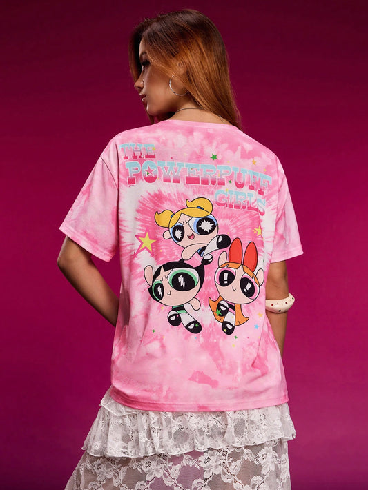 THE POWERPUFF GIRLS X SHEIN Camiseta de manga corta de ajuste holgado con estampado de letras y teñido anudado de estilo callejero casual para mujer, verano