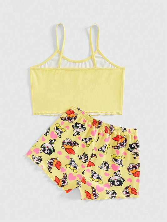 The Powerpuff Girls | ROMWE Conjunto de pijama con gráfico de dibujos animados, ribete de lechuga y cinta de contraste, para la escuela