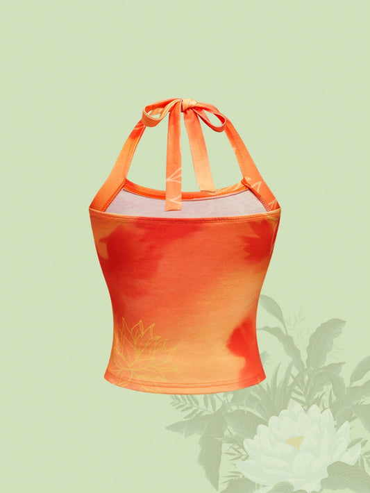 The White Lotus Blusa de verano casual de vacaciones para mujer con estampado de teñido anudado y floral, ajustada y con volantes, en color naranja con escote halter