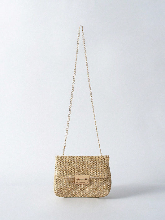 Tropiscape Bolso cruzado de unicolor dorado tejido a la moda, adecuado para el uso diario de las mujeres, que combina perfectamente con los atuendos de vacaciones. Vibraciones de vacaciones, relajación de vacaciones, pla