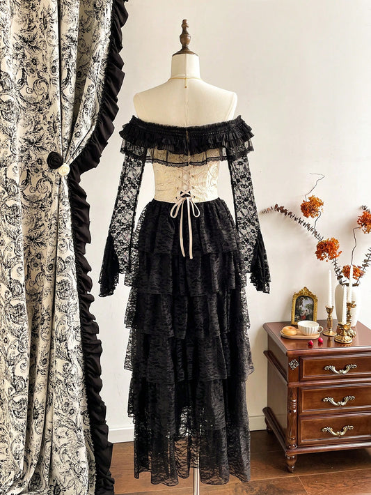 Vintamour Blusa de corsé con hombros descubiertos, mangas largas, puños acampanados, encaje de contraste, volantes y moño, de estilo elegante vintage con estampado floral jacquard para fiesta, festival y celebraciones de invierno