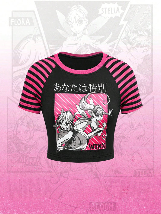 Winx Club X ROMWE Camiseta ajustada con mangas raglán a rayas, estampado de dibujos animados para mujer