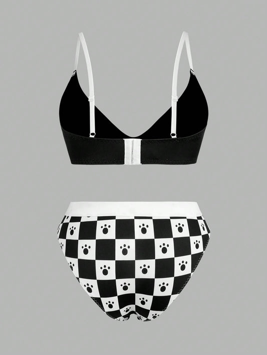 We Bare Bears X SHEIN Conjunto de sujetador inalámbrico y panty de talla grande con estampado gráfico de dibujos animados en blanco y negro a cuadros