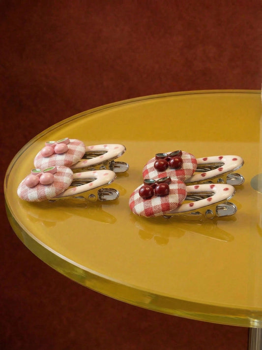 Zazumi Set de 4 piezas de pasadores de cabello con estilo coreano con motivo de flores de cerezo para mujeres - Pasadores con lunares rosados y a cuadros tipo lazo con motivo de cerezas, accesorios de cabello pequeños y