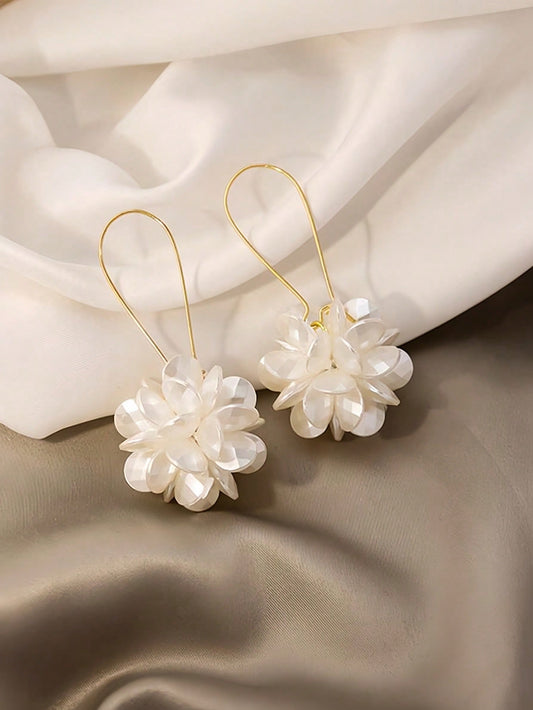 1 Par De Pendientes De Bolas De Flores Blancas Con Patrón Geométrico Largo Y Elegante, Adecuados Para El Uso Diario De Las Mujeres