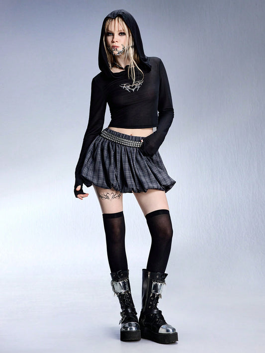 ROMWE Goth Body gótico oscuro con hombros descubiertos, bajo asimétrico, mangas acampanadas con estampado flockado y diseño cruzado de metal para mujer, para el verano y la playa