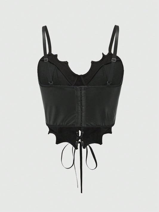 ROMWE Goth Atractivo corsé de mujer con forma de murciélago con parches de PU gótico Y2K en contraste negro y rojo, con encaje de telaraña y ballenas