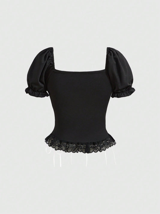 ROMWE Goth Corset superior de camiseta ajustada con lazo, parche de cruz, ribete de encaje y mangas abullonadas, estilo gótico