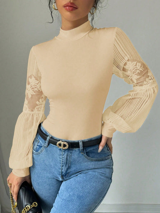 Elenzga Bodys de mujer con cuello alto, mangas farol y parches de encaje