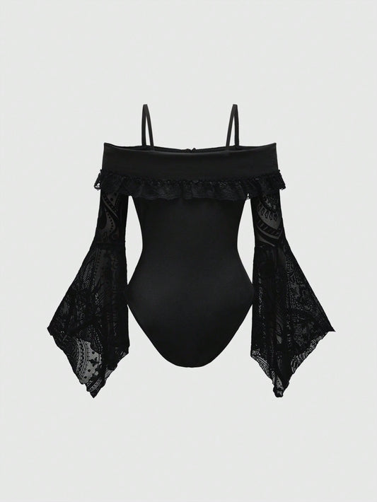 ROMWE Goth Body gótico oscuro con hombros descubiertos, bajo asimétrico, mangas acampanadas con estampado flockado y diseño cruzado de metal para mujer, para el verano y la playa