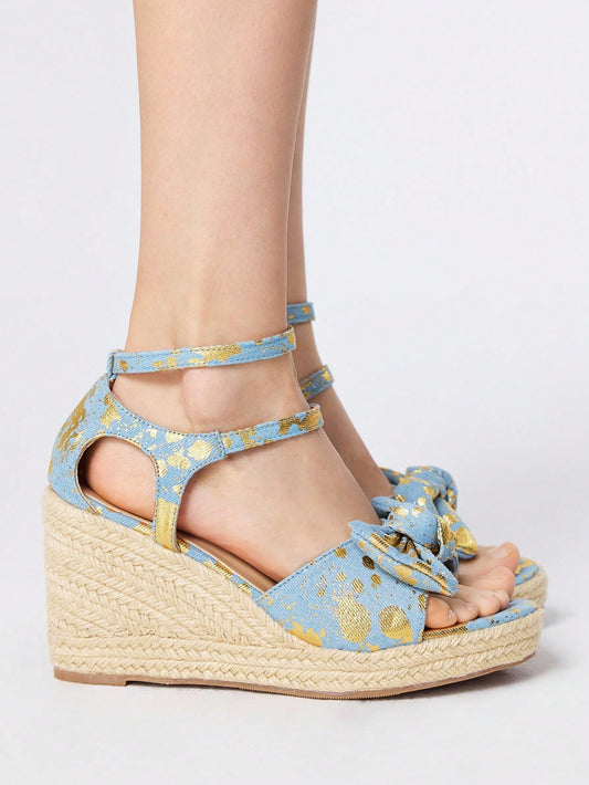 ROMWE Kawaii Sandalias de cuña con punta abierta y adorno de lazo con flores para mujer