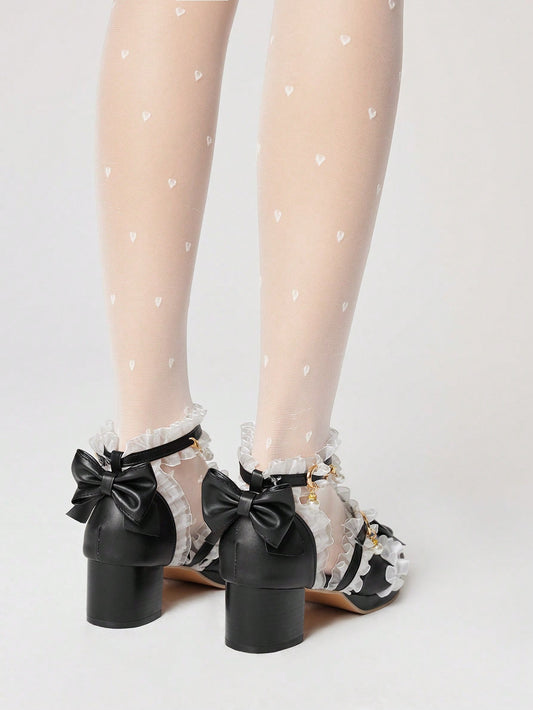ROMWE Kawaii Tacones con correa de encaje de estilo lolita con puntera cerrada y ribete de encaje para mujer, color negro