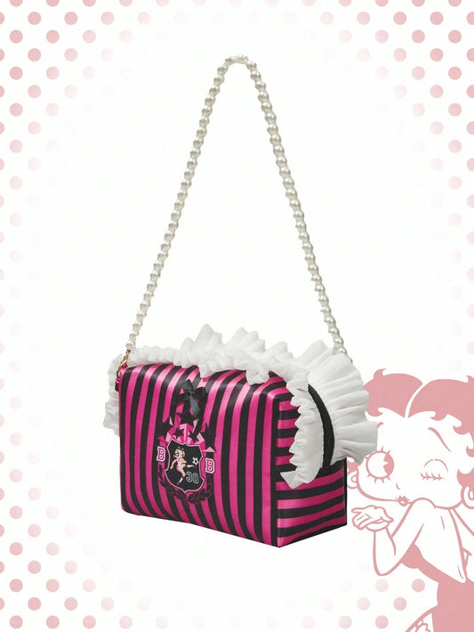 Betty Boop | ROMWE Bolsa de cosméticos portátil y de gran capacidad con asa con cuentas, diseño lindo a rayas y gráfico de figura