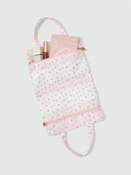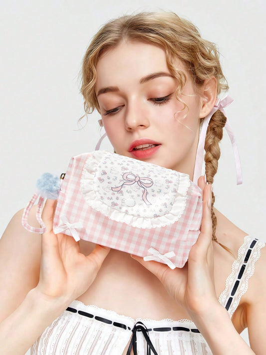 ROMWE Kawaii Bolsa de almacenamiento portátil de gran capacidad para maquillaje con patrón de lazos a cuadros rosa encantador