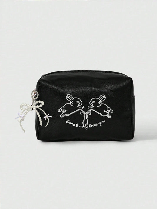 ROMWE Kawaii Modelo: 336027 Bolsa de cosméticos para mujer con bordado de conejo y lazo, billetera multifuncional, organizador de artículos de tocador de viaje, regalo para dama de honor