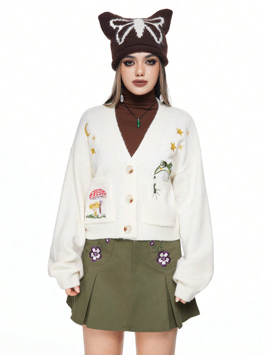 ROMWE Fairycore Cárdigan de punto bordado con diseños de hongos, ranas, estrellas y lunas, en estilo vintage cottagecore para mujeres