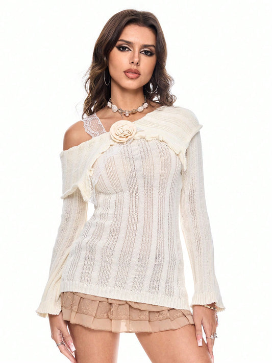 ROMWE Fairycore Jersey holgado transparente con mangas ajustadas de campana, cuello asimétrico y parches de encaje con estilo retro Y2K para mujer