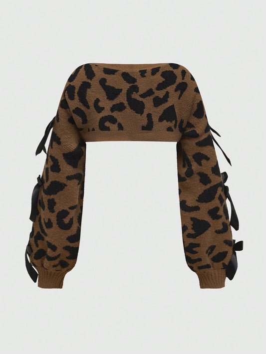 ROMWE Kawaii Cárdigancroptop corto de mujer con lazo y estampado de leopardo vintage y sexy