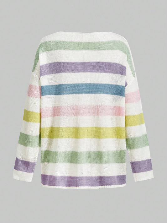 ROMWE Kawaii Suéter Con Rayas Y Bloques De Color Con Hombros Caídos