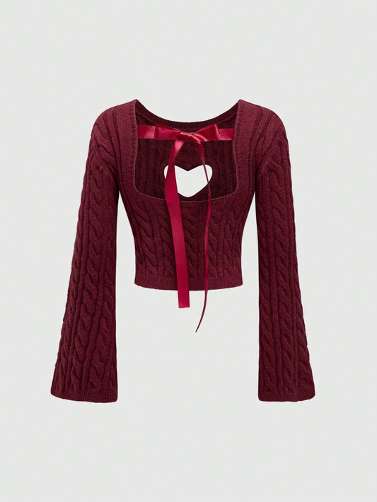 ROMWE Kawaii Suéter de mujer con corazón hueco y lazo para el Día de San Valentín